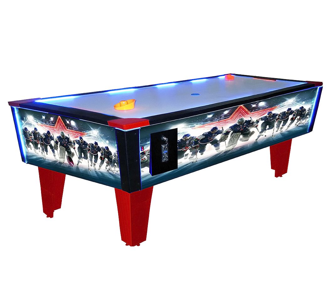 Принцип игры простой и интуитивно понятый — клюшкой забить гол противнику и не допустить попадание шайбы в свои. Благодаря воздушной подушке, которую создает встроенный в стол компрессор, играть очень комфортно и шайба и клюшки легко скользят по столу. Покрытие стола изготовлено из ударопрочного и износостойкого полистирола, а борта и ножки металлические, что повышает срок службы аэрохоккея.