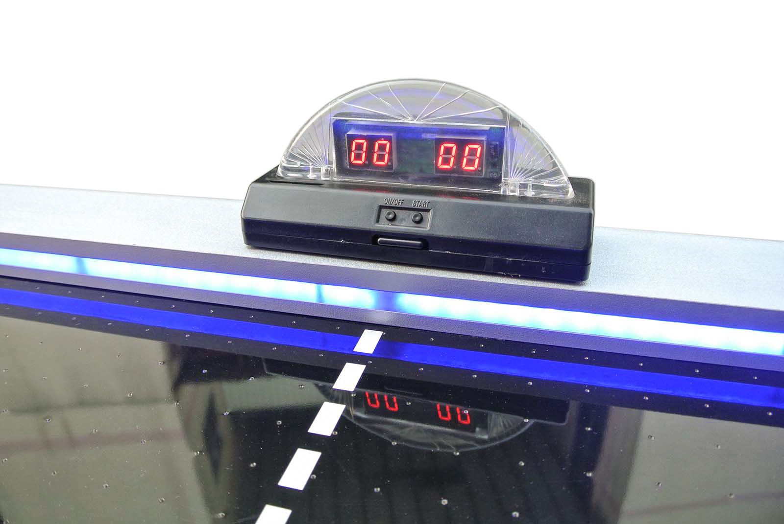 Игровое поле надежно защищено пленкой ПВХ для захватывающих матчей нон-стоп.Особый драйв игре предает диодная подсветка космически-синего цвета.За ходом игры помогает следить электронное табло со звуковым сопровождением.