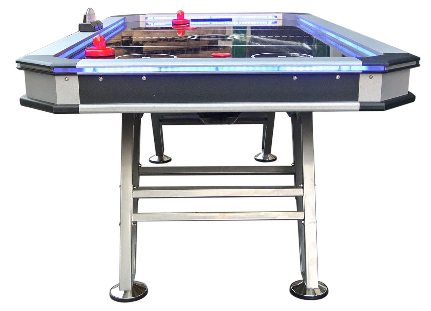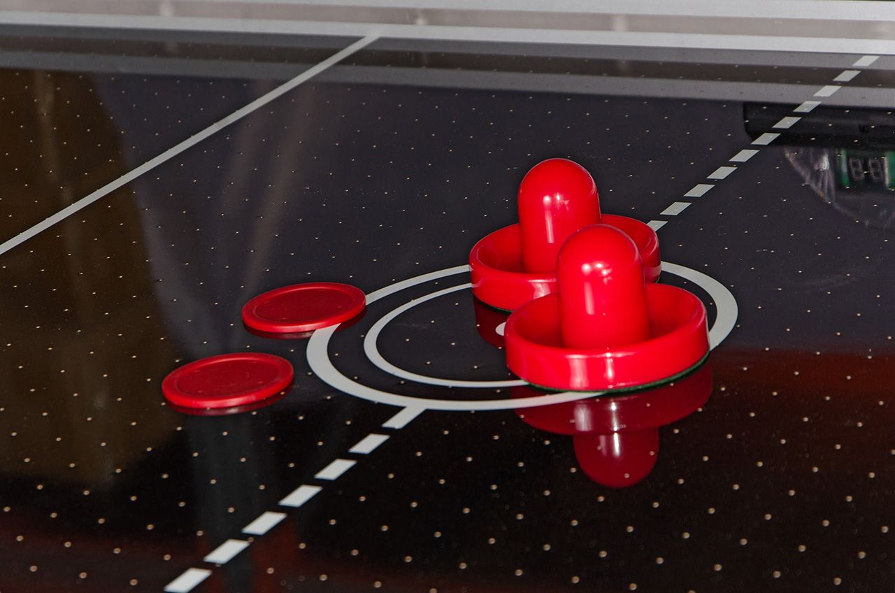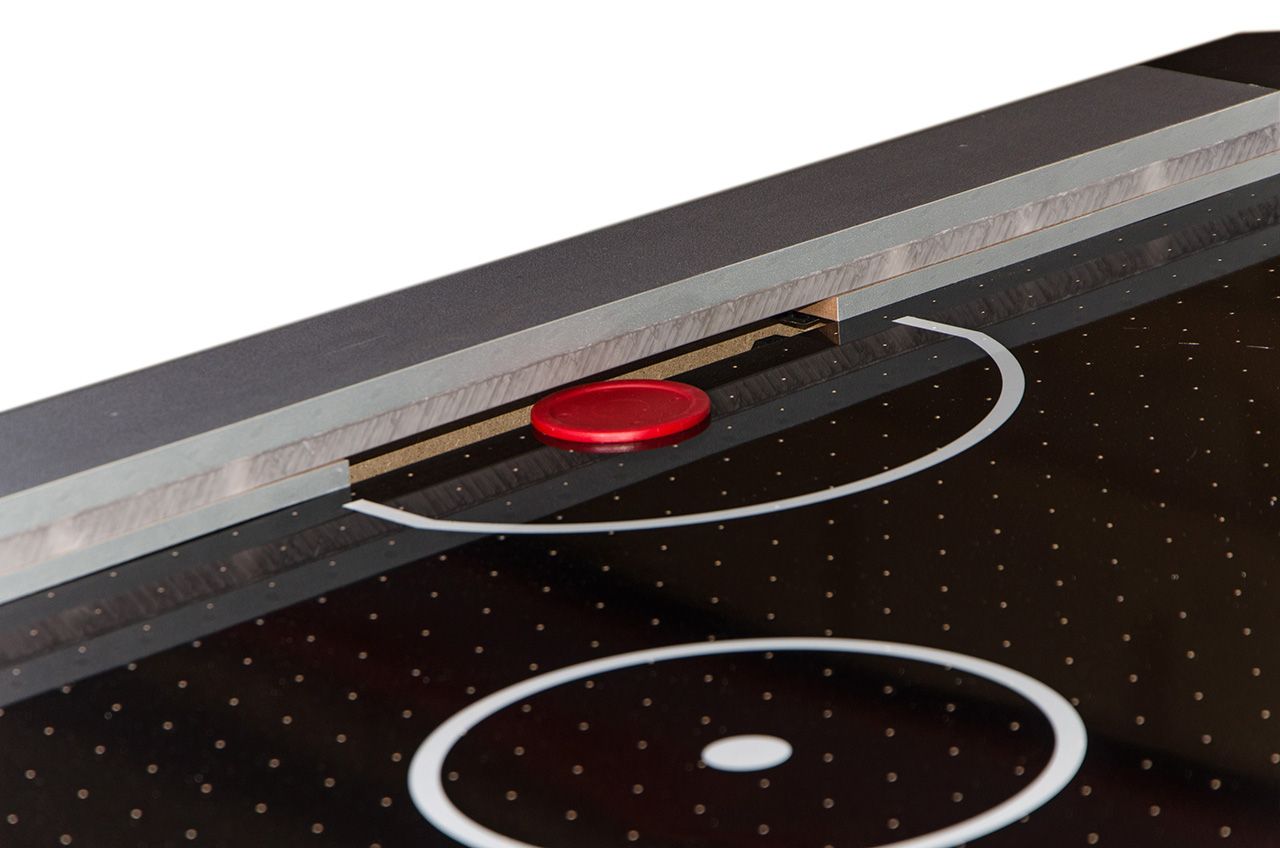Эффектный стол для аэрохоккея с мощным компрессором, который подает воздух через перфорированные отверстия на игровом поле, создавая идеальную воздушную подушку для быстрого полета шайбы.