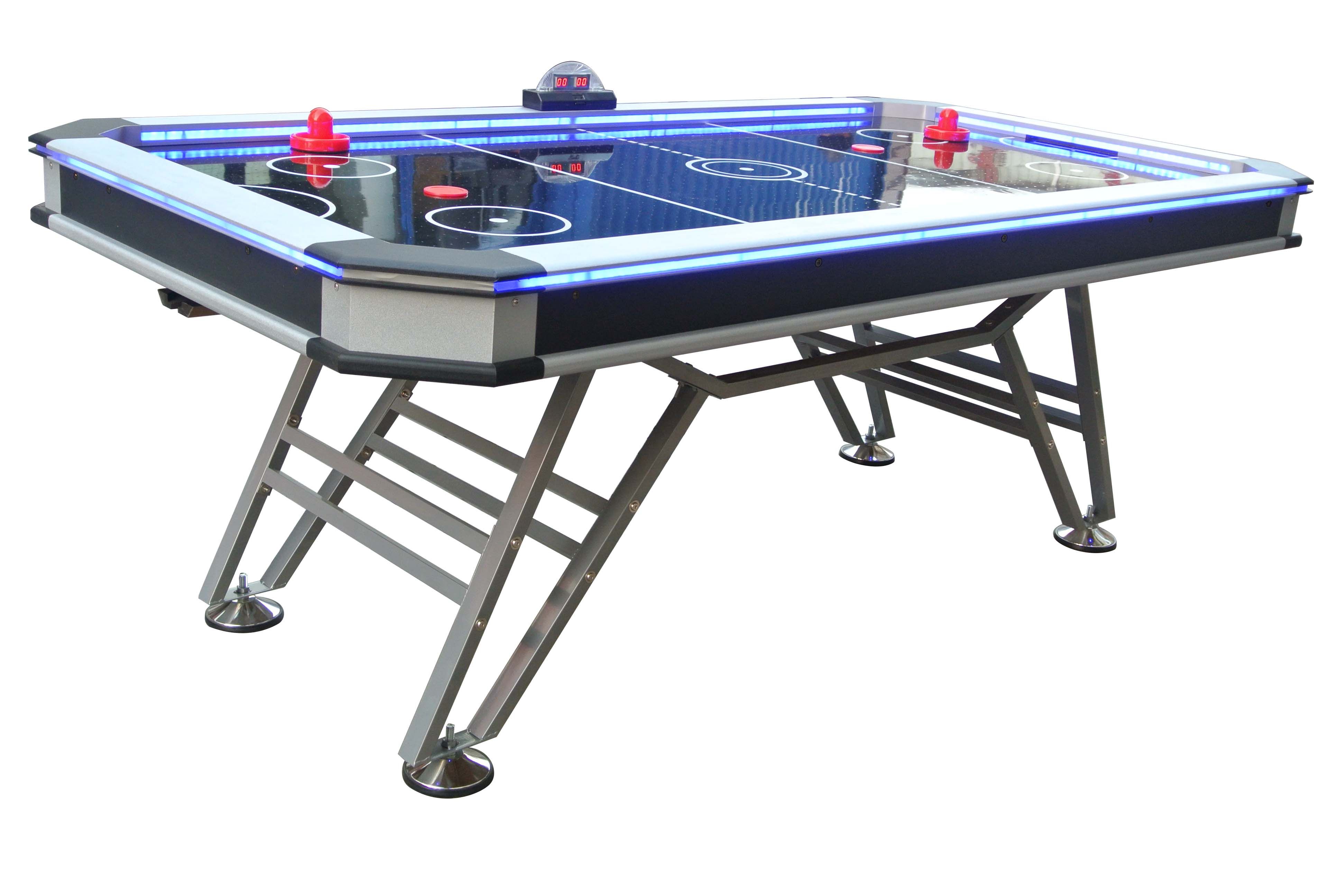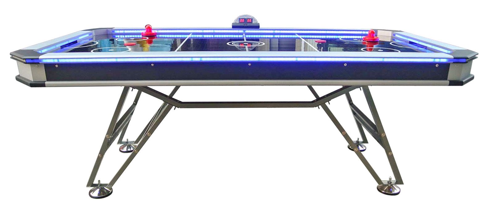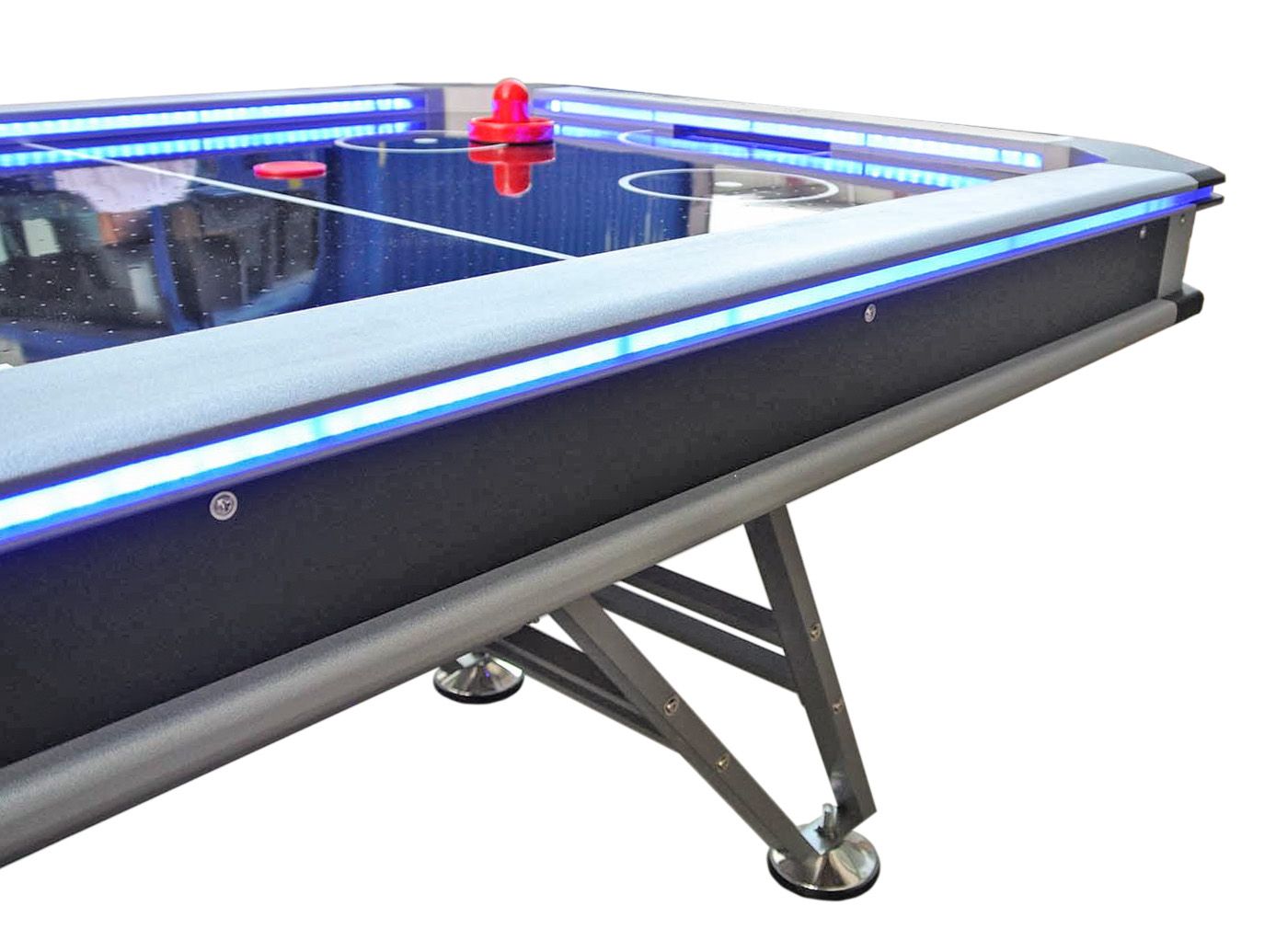 Эффектный стол для аэрохоккея с мощным компрессором, который подает воздух через перфорированные отверстия на игровом поле, создавая идеальную воздушную подушку для быстрого полета шайбы.