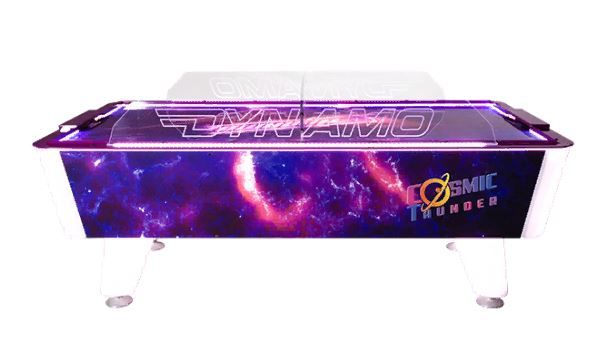 Модуль разноцветной светодиодной подсветки и система интерактивной звуковой поддержки Dynamo Cosmic Thunder станет настоящим хитом как во время рекламной паузы, так и во время игры. Поверхность игрового поля из поликарбоната со встроенной системой подсчета очков отличается гладкостью и обеспечивает высокую скорость игры. Боковые панели, рама корпуса, ножки и игровое поле оснащены неоновой подсветкой для привлечения внимания посетителей. Прозрачные бортики из прочного поликарбоната с логотипом производителя выполняют функцию защиты игроков от отскоков шайб. Dynamo Cosmic Thunder – идеальная модель для семейно-развлекательного центра или любой коммерческой площадки, нацеленной на получение серьезного дохода.