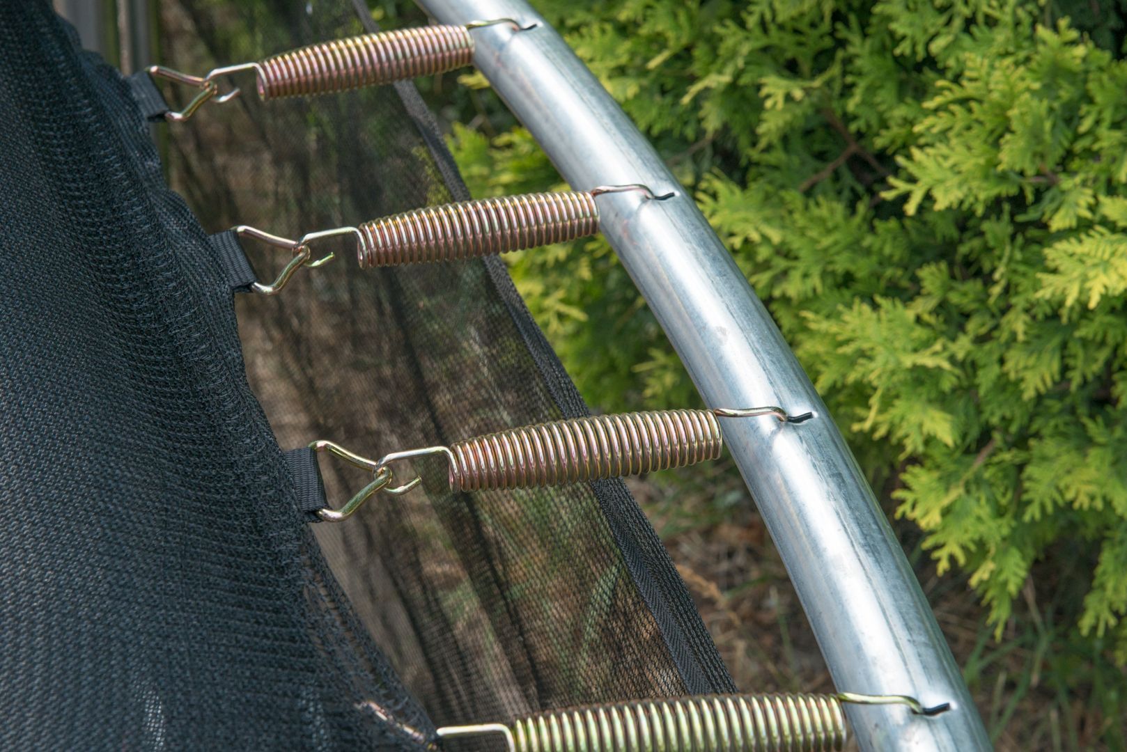 - 72 пружины обеспечивают надежное крепление полотна к раме и равномерное распределение нагрузки. Максимальный суммарный вес пользователей — 200 кг, что является лучшим показателем на рынке для батутов данного класса.