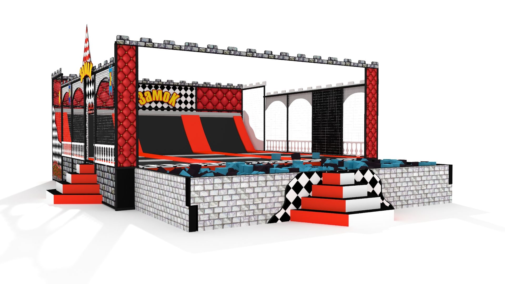 Современный батутный комплекс для активных игр и спортивных тренировок.