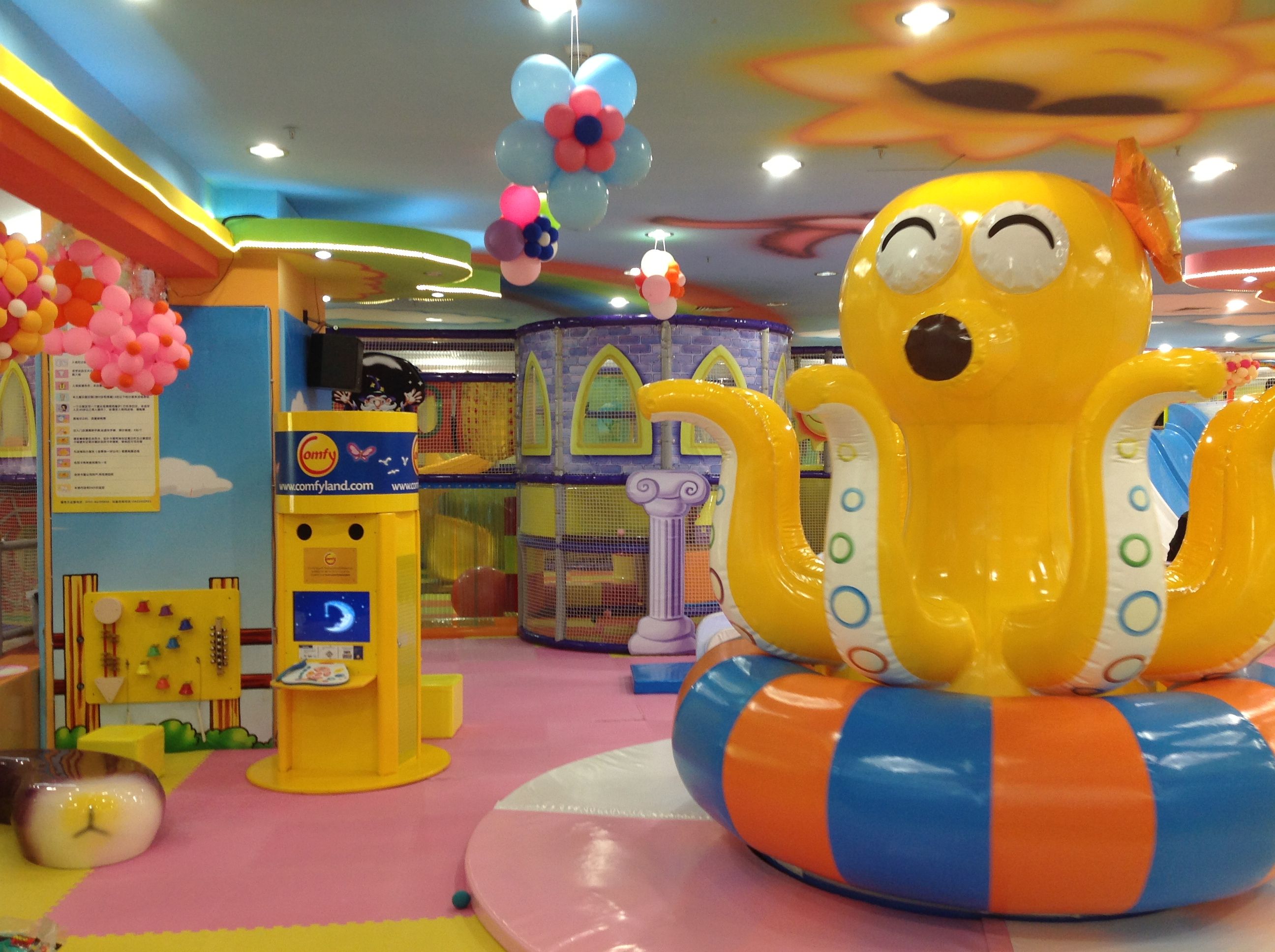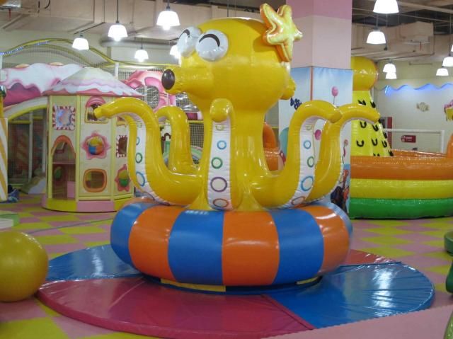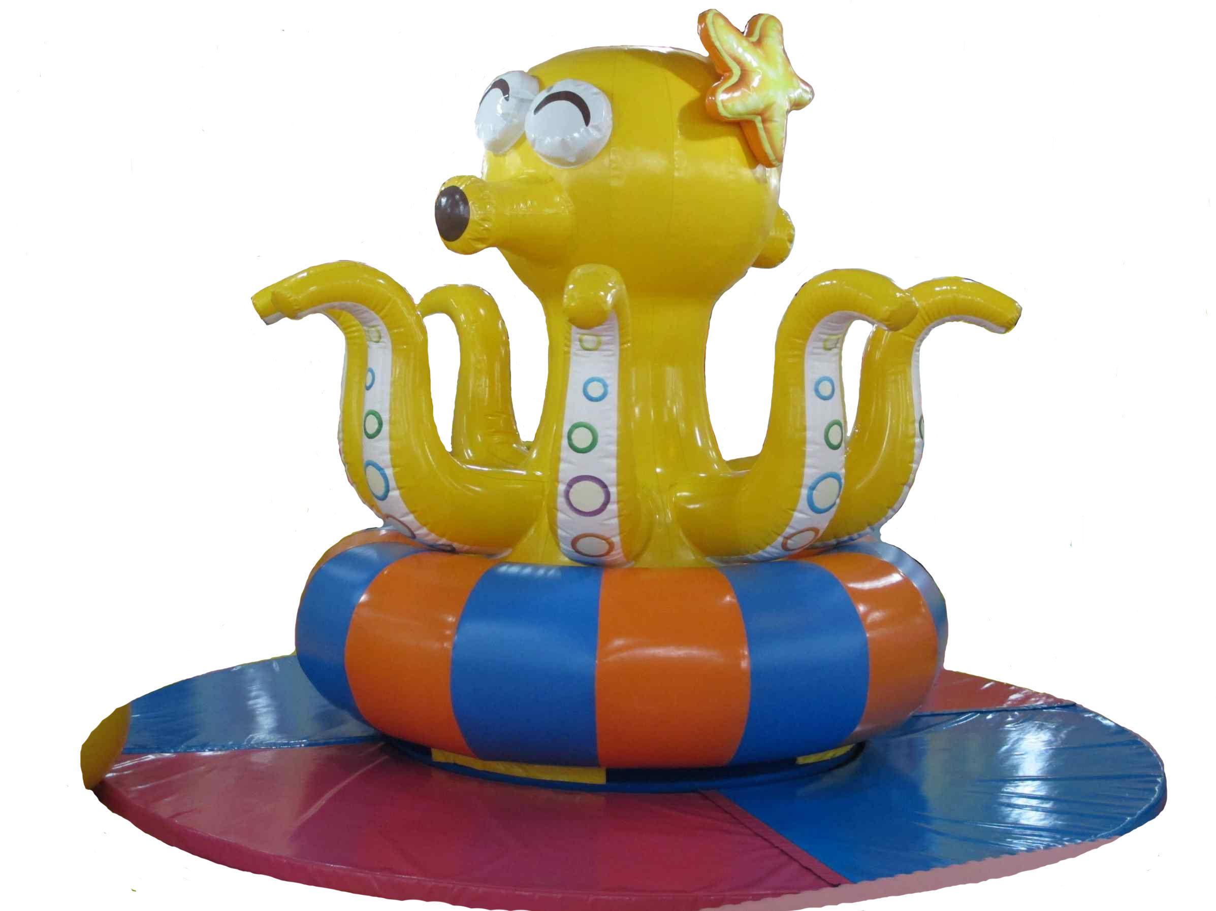 Надувная конструкция, приводится во вращение при помощи электрического двигателя. Дети могут лазать, прыгать на карусели. Материал отделки - цветной баннер с блестками!