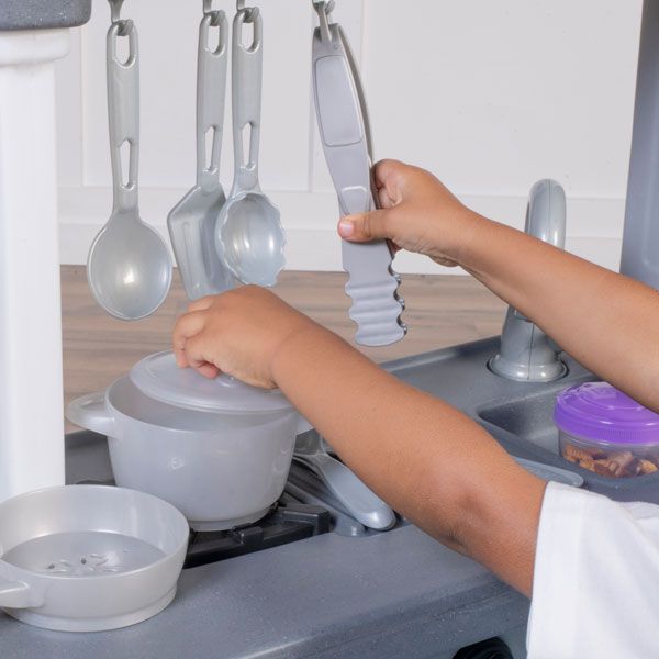 - В комплекте: игровая кухня, большая корзина для хранения и набор аксессуаров из 23 предметов.