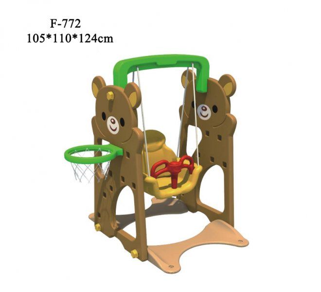 Детские качели с удобным пластиковым сиденьем с высокой спинкой и съемной передней защитной перекладиной с перегородкой для ножек, которая защищает ребенка от падения во время раскачивания, благодаря чему на них может качаться совсем маленький ребенок. Перегородка снимается, когда малыш подрос и уже может качаться самостоятельно.Так же в комплексе имеется баскетбольное кольцо. Можно использовать для игр, как в помещении, так и на улице.