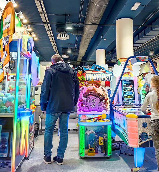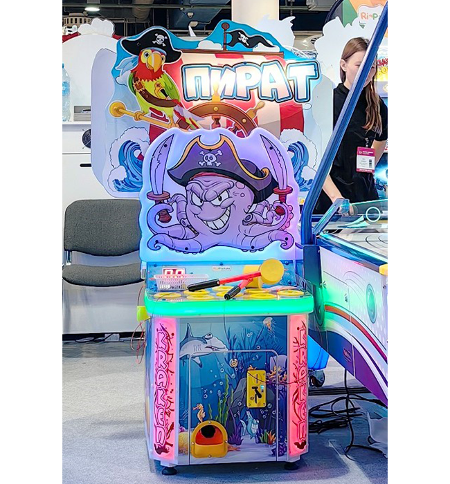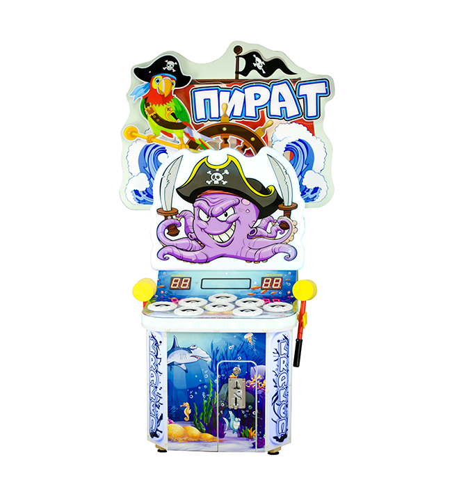 Детский игровой аппарат «Пират» - увлекательная колотушка для детей от 2-х лет. Цель игры – успеть попасть молоточком по всем выпрыгивающим фигуркам. Фигурки появляются сначала медленно по одной, затем ускоряются и выпрыгивают группами по две-три. Всего 99 выпрыгиваний. При попадании в цель игра сопровождается яркими эффектами и подбадривающими фразами на русском языке. Предусмотрена возможность настроить призовые игры при высоких результатах. Аппарат оснащен безопасными мягкими молоточками среднего размера, удобными для детей любого возраста. При установке дополнительного оборудования предусмотрен приз по завершении игры.