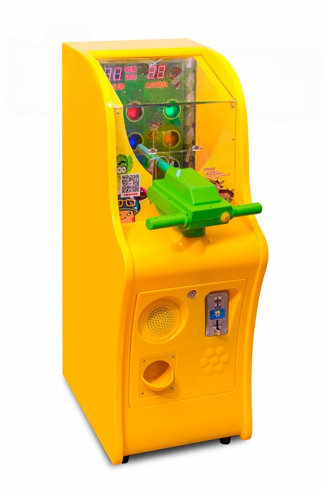 Яркий желтый детский игровой аппарат. В верхней части находится прозрачный экран с разноцветными мишенями и двумя цифровыми дисплеями. Снизу установлена зеленая пушка с двумя ручками. На передней панели аппарата расположены монетоприемник, динамик, и отверстие для выдачи приза.