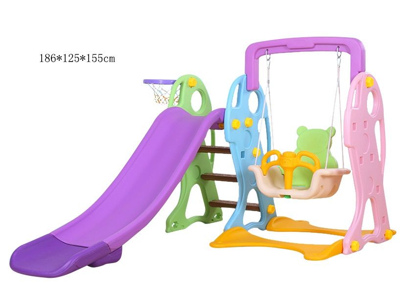 однородного и надежного пластика. Детский комплекс выполнен в ярких цветах и имеет оригинальный дизайн. Краски устойчивы к ультрафиолетовому излучению, и изменениям температуры, устойчивые к истиранию и воздействию внешней среды. Игровая площадка соответствует ГОСТам, которые указаны в сертификатах соответствия. Данный комплекс трансформируется : качели можно снять, оставив горку с баскетбольным кольцом, или же, наоборот, убрать горку оставив качели Детская горка с волнообразным скатом регулируется по высоте и обеспечит обеспечит плавный спуск и мягкое приземление Вашему ребенку, широкие ступени и надежные поручни помогут ему подниматься на горку самостоятельно, боковые стенки конструкции имеют рельефную структуру,