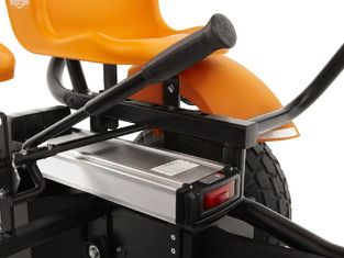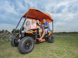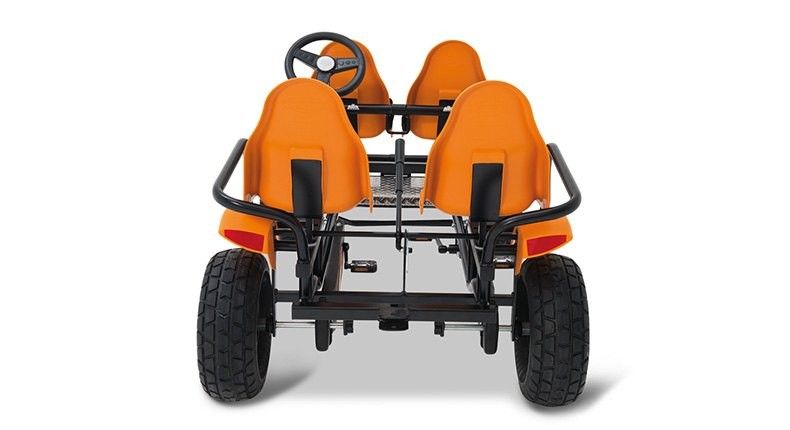 Версия семейного веломобиля Gran Tour Off Road с электро двигателем мощностью 500 Вт. Электродвигатель облегчает движение веломобиля, при этом, необходимость вращать педали остается. Двигатель помогает движению веломобиля до скорости 20 км/ч. Работы батареи хватает на 2 часа. В комплект веломобиля входят 2 батареи и устройство подзарядки. Совершенно новая концепция включает такие особенности как: колёса с крупным протектором, мощная лёгкая рама (вес пассажира может быть более 100 кг.), один ведущий руль, ручка управления электро двигателем, одновременно могут крутить педали 2 человека, передние кресла оборудованы удобными большими подлокотниками и ремнями безопасности. Никогда ещё семейные веломобили не были выполнены в таком продуманном дизайне! Привод F рассчитан на движение только вперед; Солнцезащитный навес является опцией и приобретается отдельно.