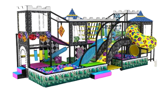 Игровой лабиринт оформлен под городской замок. Каркас оформленый в серо-черных цветах и яркие элементы наполнения создают яркий, но гормоничный контраст. В лабиринте три уровня, две горки: винтовая и односкатная открытая. В лабиринте 2 сухих бассейна, есть лазы качели и подвесные элементы.