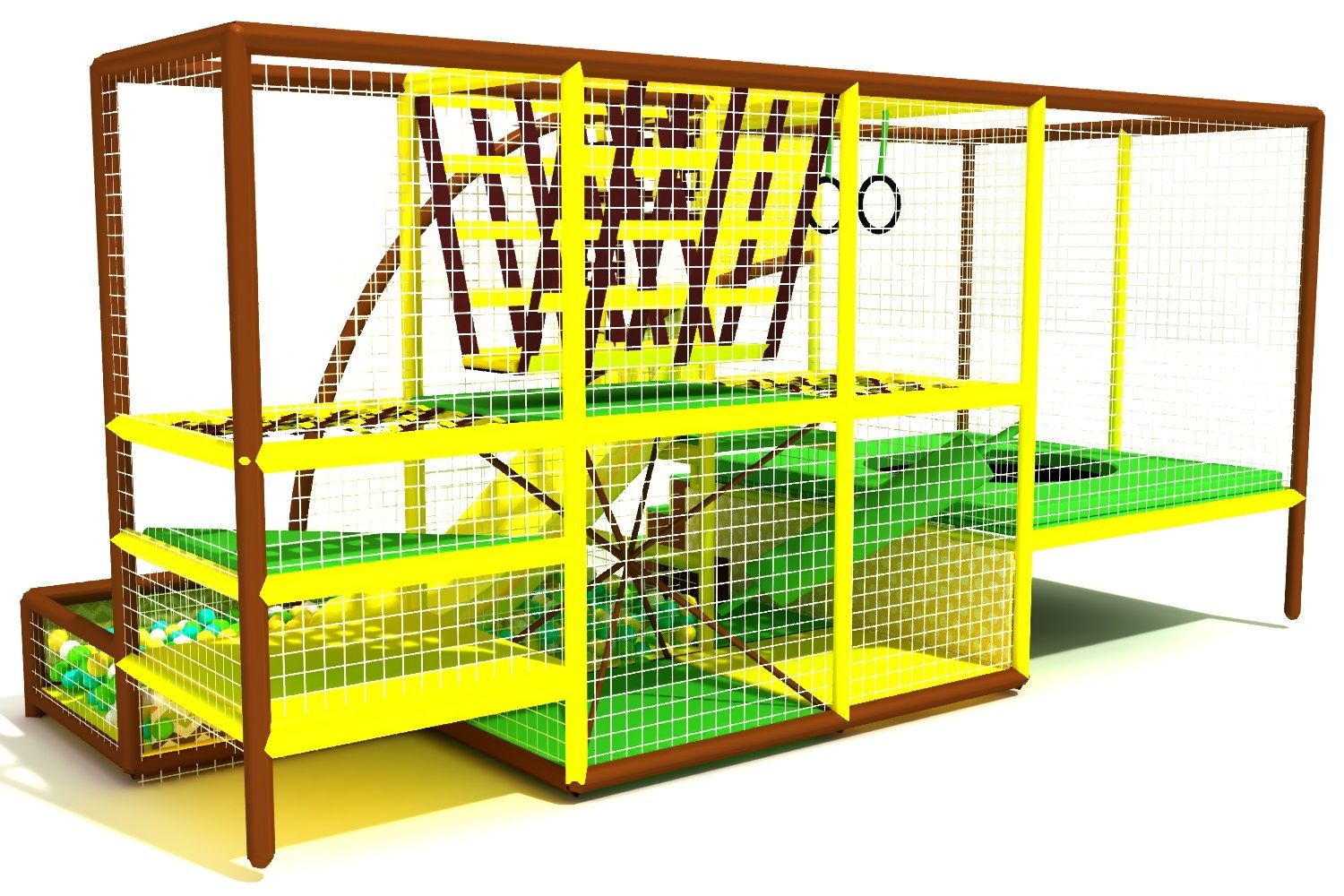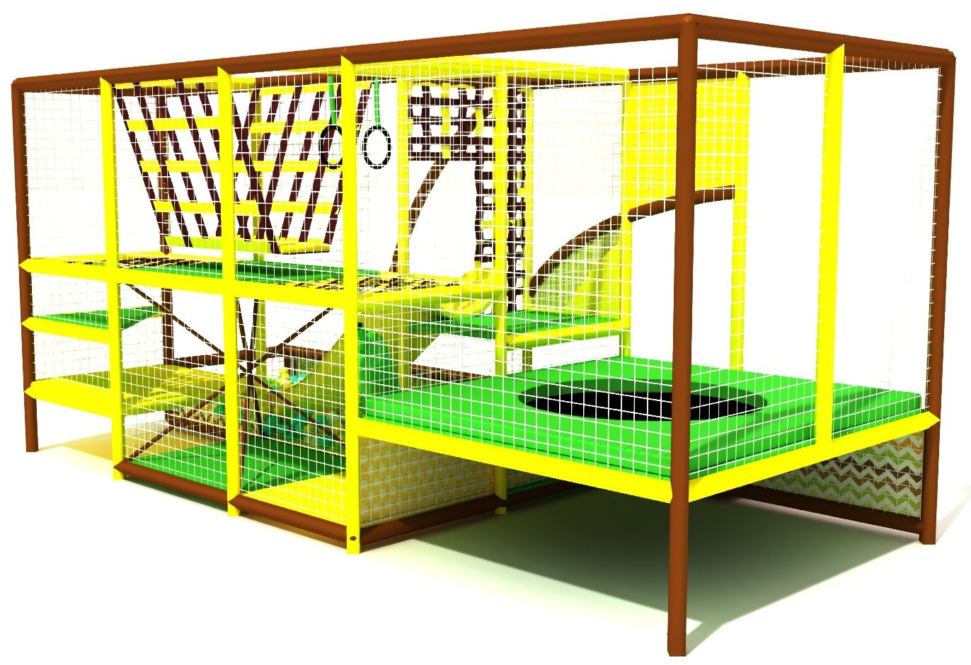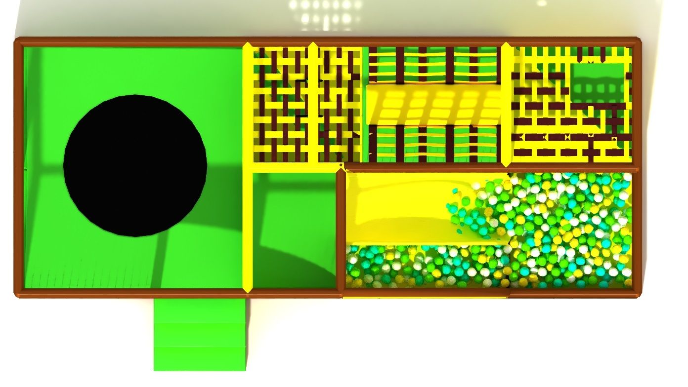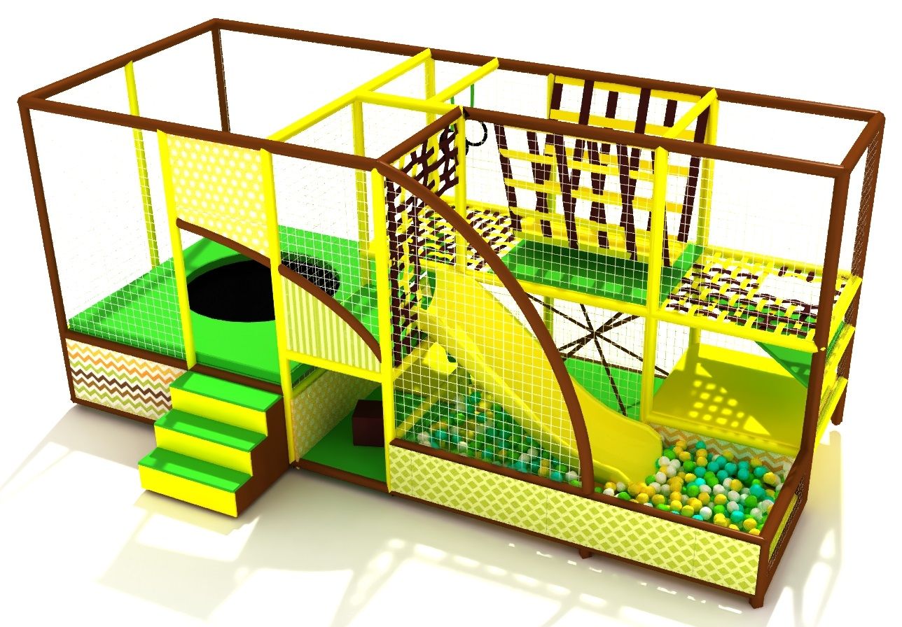 Небольшой, яркий и функциональный игровой лабиринт для детей. Разделен на две зоны: спортивный батут и игровая с лазами, подвесным мостиком, паутинкой, горкой и сухим бассейном. Зоны отделены друг от друга защитной сеткой во избежание травм.