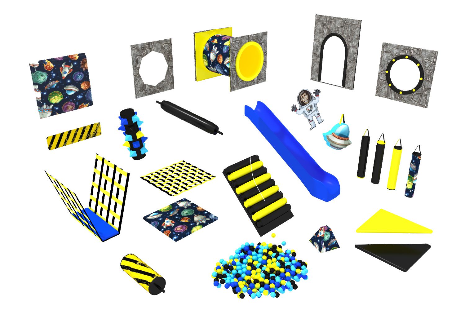 Детский игровой лабиринт выполнен в космической тематике, в желто черных цветах. Выглядит контрастно и ярко. В лабиринте 3 уровня с лазами препятствиями и подвесными элементами. В сухой бассейн с разноцветными шариками можно спуститься по двум горкам.