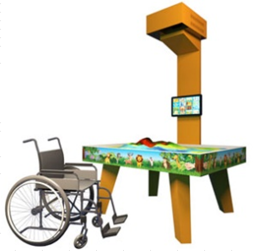 Увеличеная высота для возможности пользования инвалидами колясочникамиВысота до резервуара с песком 670 мм.Сенсорный экран для выбора игрне комплектуетсяЯркость проектора, Люмен4500Мощность звука, Вт10Доступ к интернетувстроенный WiFi модульМетодическое пособиев комплекте -