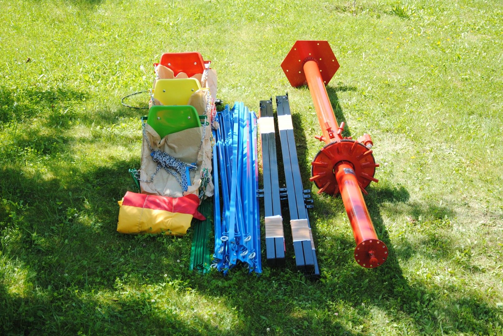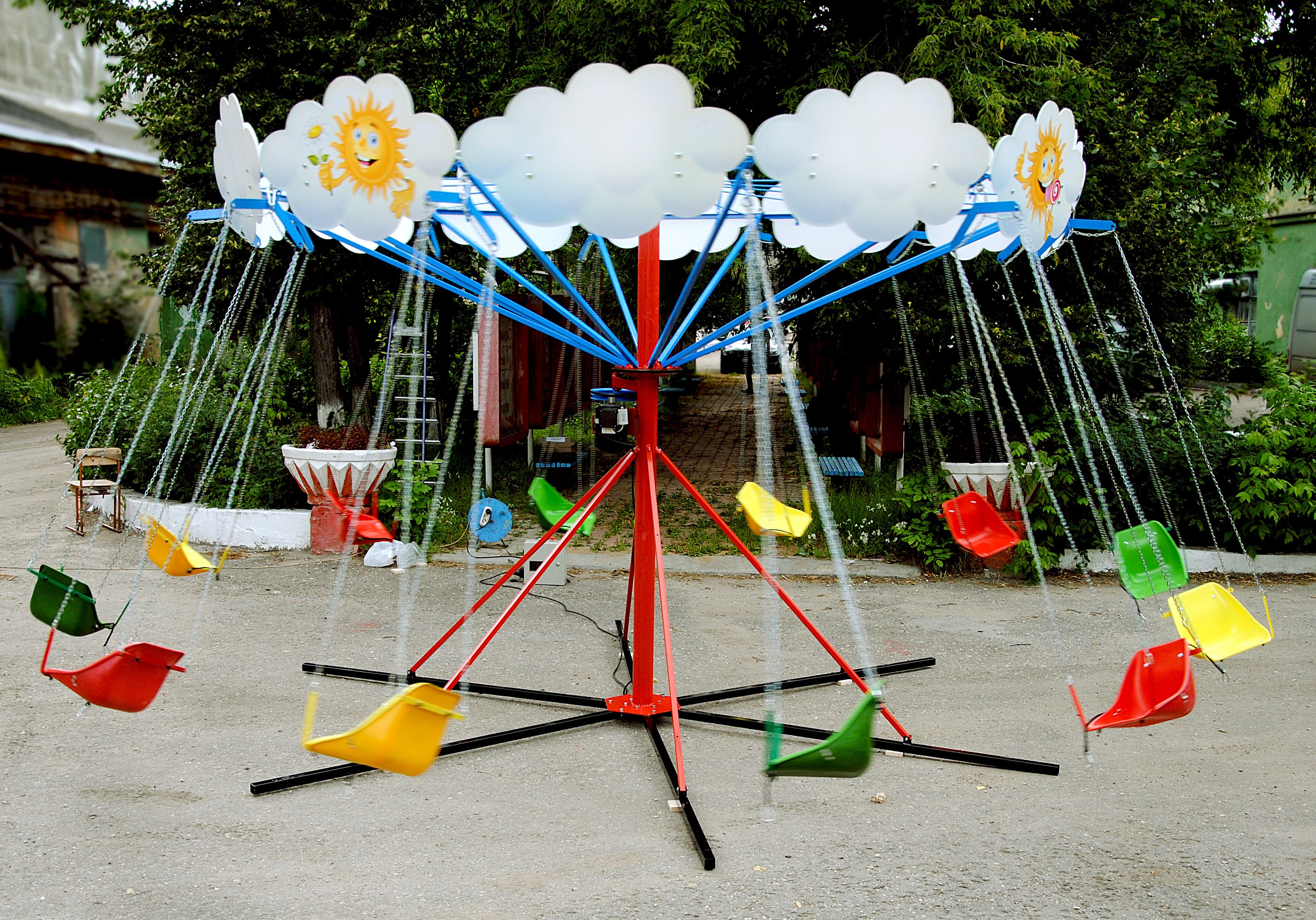 Комплектация включает: металлический каркас, стеклопластиковые сиденья с цепями и необходимыми страховками безопасности, декоративные панели (облака), электродвигатель и пульт управления (включающий регулируемое реле времени, кнопки пуск/стоп, экстренной остановки), комплект документов RB4.