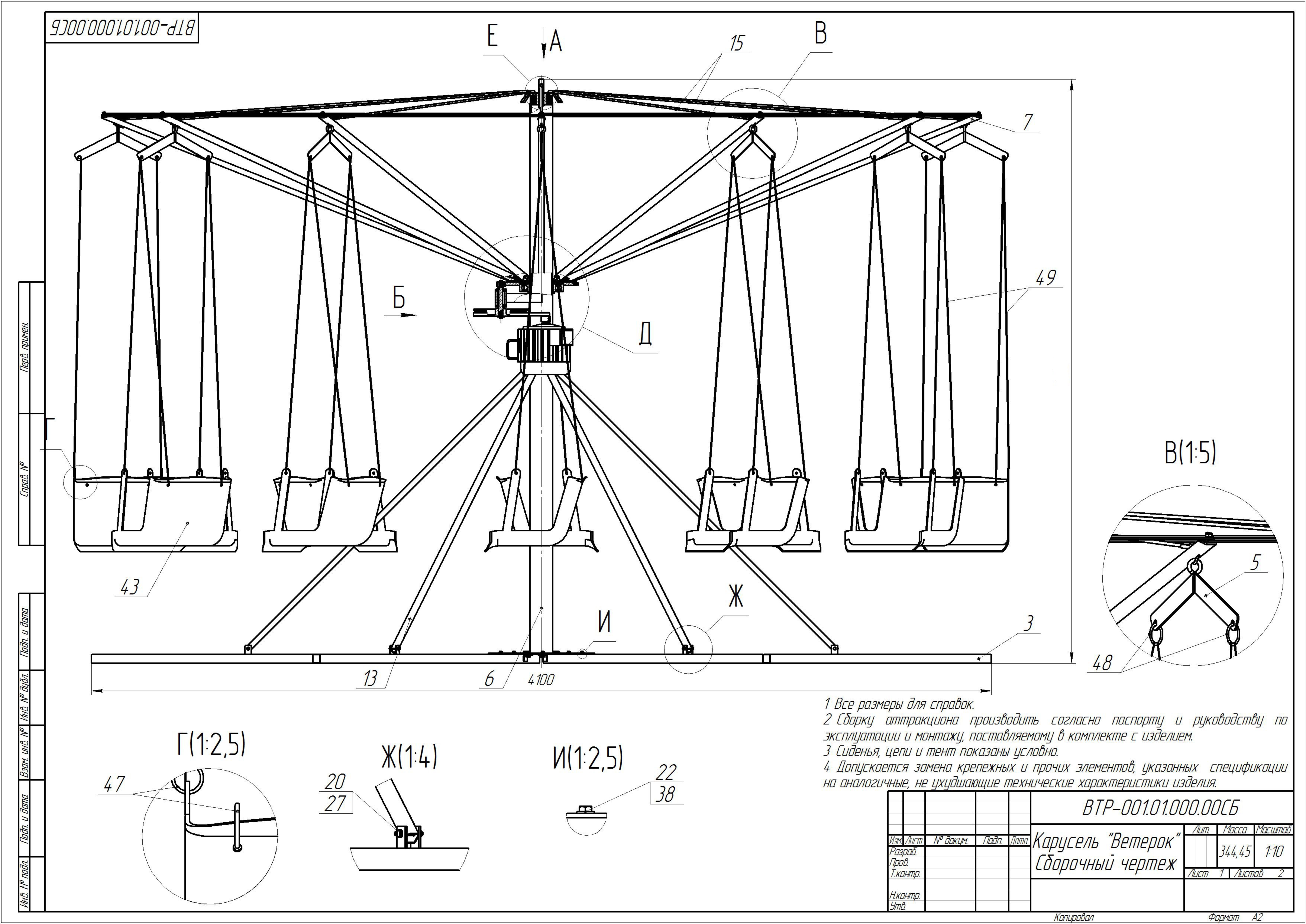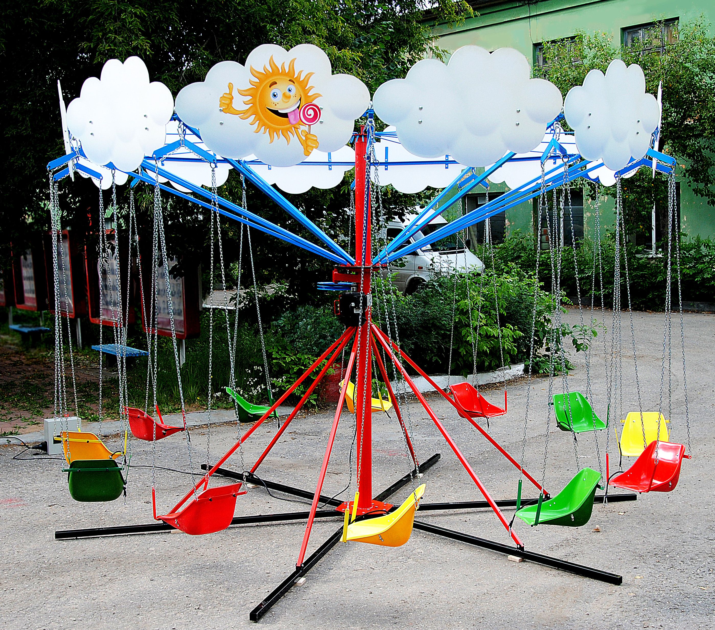 Диаметр4.2 м.Вес270 кг.Посадочных мест12Напряжение220 VПотребление0,75 кВтСкорость вращения12 об/минВремя монтажа20 мин.Таймер отключениярегулируется от 2 до 10 минут.Самая длинная деталь2.5 м.Страна происхожденияРоссияВремя сеанса3 мин.Диаметр по ограждению8 метровДиаметр с учетом разлета сидений6 метровСтепень биомеханического рискаRB4Возраст пассажировдо 10 летУстановка на неровной поверхностиРегулируемые нижние лапы по неровности площадкиИзготовление под заказда -