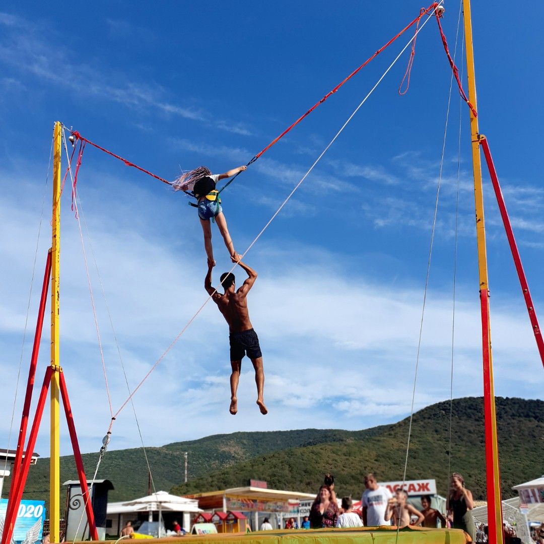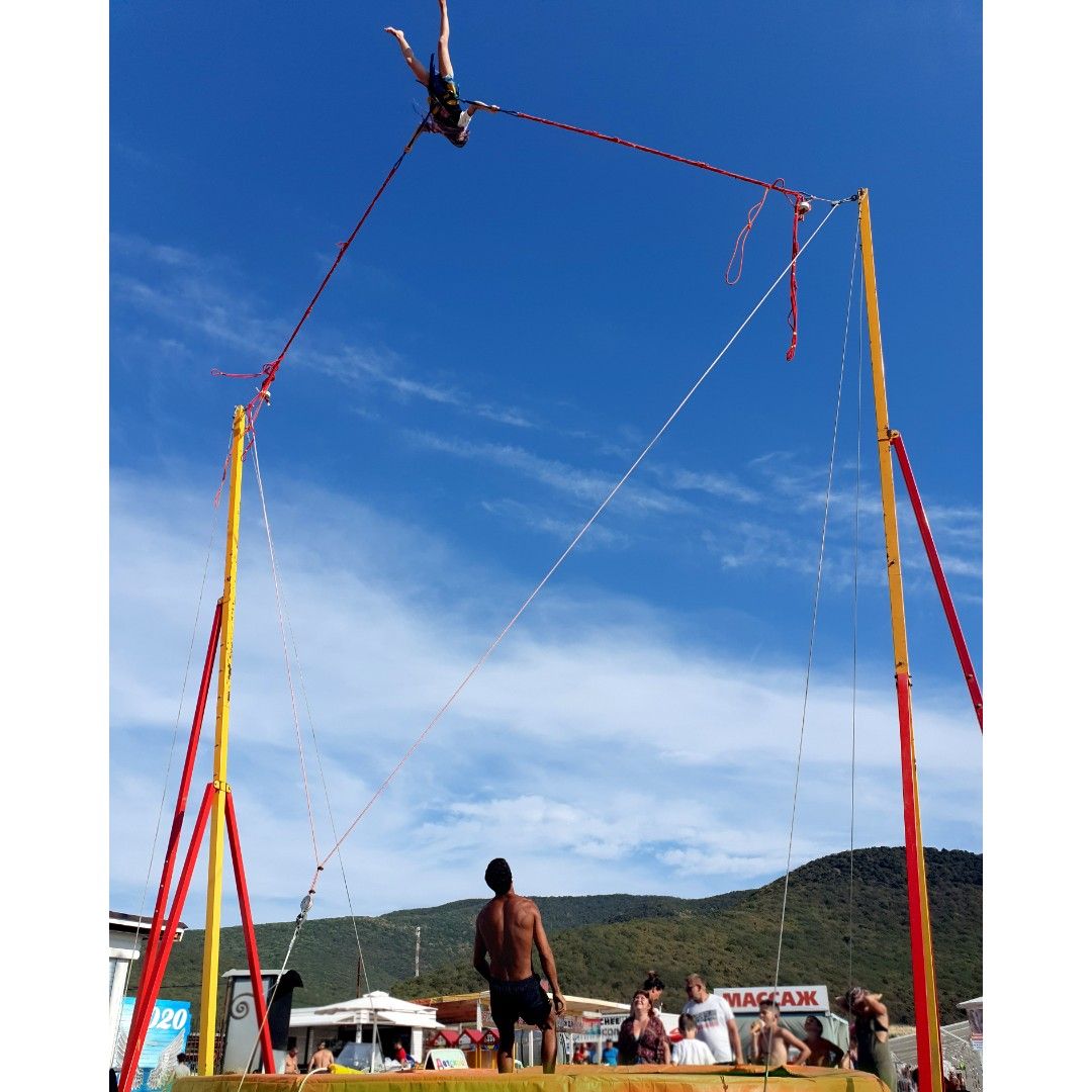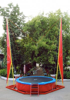 Экстремальный мобильный аттракцион - тарзанка. Рассчитан на одного человека. Диаметр установленного батута – 4,3 метра. Высота – 8 метров. Площадь необходимая для установки аттракциона - 8 х 8 м.