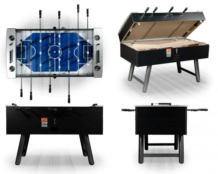Стол идеально подходит как для коммерческого, так и домашнего использования. Ноги изготовлены из нержавеющей стали, и снабжены системой домкратов, что позволяет установить стол на неидеально ровной поверхности. Игровое поле выполнено из ударопрочного материала, усиленного стекловолокном, что придает ему дополнительную стойкость к царапинам. Традиции испанского футбола-эмоциональный, взрывной характер игры в сочетании прагматичностью с нацеленностью на результат-именно это выделяет эту модель из всех остальных. Конструкция усилена металлическими стержнями, придающими дополнительную жесткость. Ручки выполнены из каучука, что гарантирует отличный контакт с ладонями. Так же стол оснащен программируемым жетоноприемником, в комплект входят 50 жетонов. Инструмент для сборки, а также запасные мячи для игры прилагаются. Размер стола-145х75х86, размер игрового поля - 117 х 68 см, вес-83 кг.