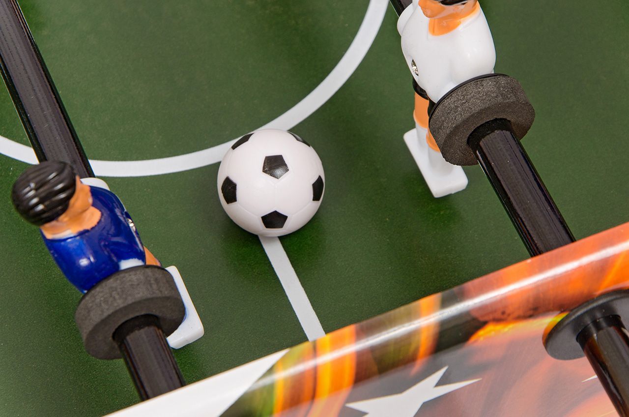 Настольный футбол «Mini S» компактных размеров. Яркий дизайн и стильные хромированные штанги черного цвета. Игроки прокрашены хорошо, поле сделано из МДФ с зеленой ламинацией. Разметка чёткая. В комплекте два мяча и инструкция по эксплуатации. Такой стол может стоять в школьном классе, игровой комнате, на балконе, в гостиной. Где бы не расположили кикер «Mini S», он всегда будет собирать вокруг себя любителей настольного футбола.