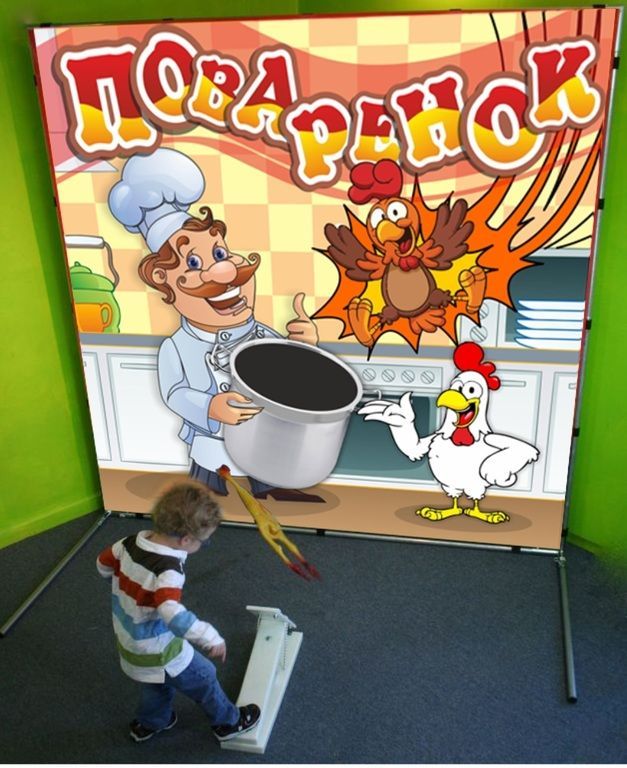 Новинка на рынке ярморочных аттракционов! Очень привлекательный, яркий аттракцион Аттракцион «Поваренок»! Цель игры: необходимо нажатием ноги на специальную катапульту, попасть кормом в кастрюлю повара!