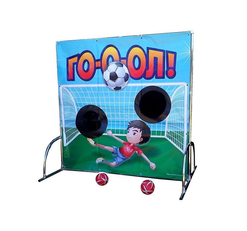 Попасть мячом в отверстие в баннере с расстояния минимум 2-3 м, можно больше если позволяет площадка, где стоит аттракцион. Попасть очень трудно, баннер прочный, от многочисленных ударов мячом ничего с ним не происходит.