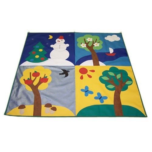 Коврик из мягкого материала разделен на четыре сектора, каждый из которых выполнен в виде аппликаций, иллюстрирующих разные времена года.
