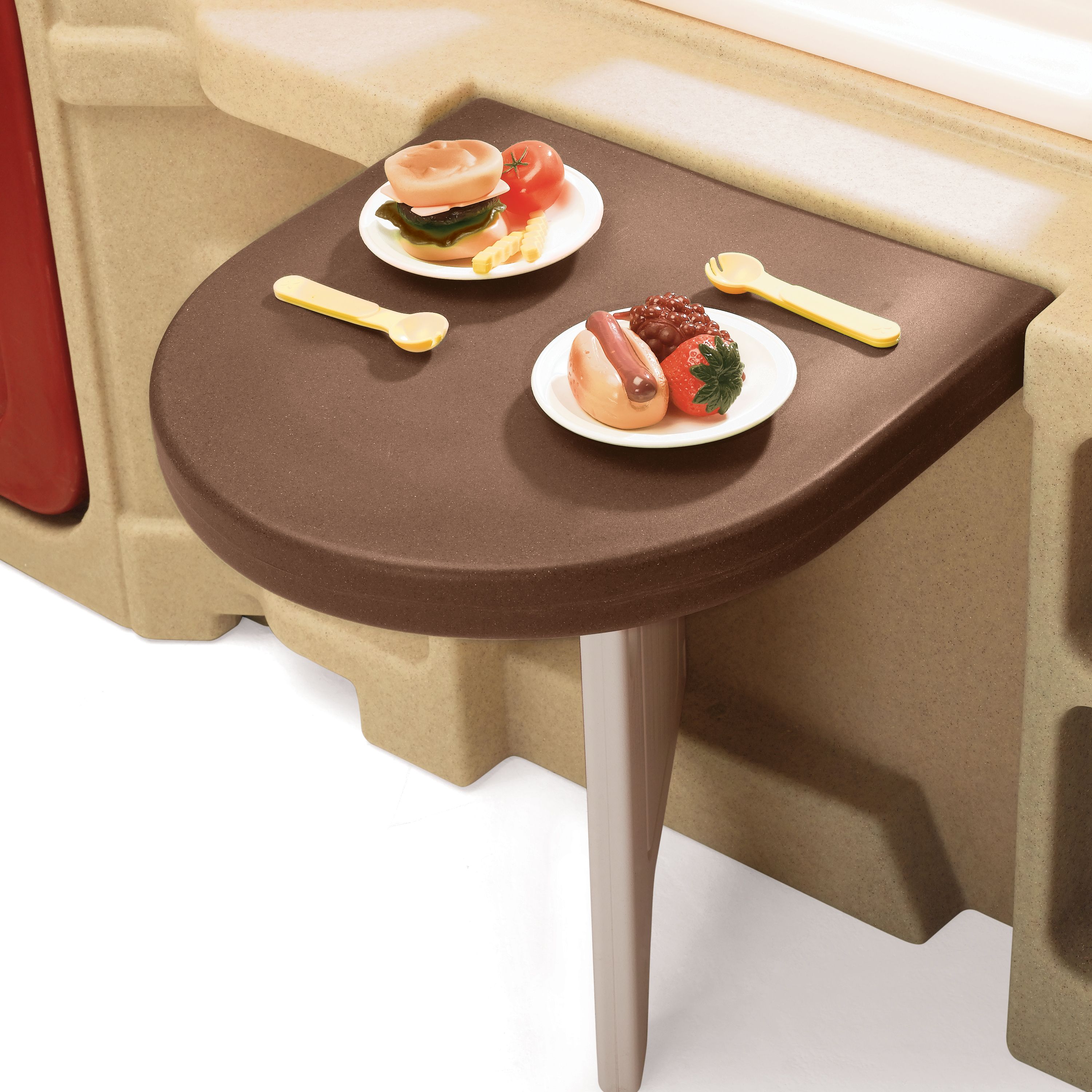 Для помещения или улицы. Два больших окна эркера, двухскатная крыша с прозрачным люком, коврик у двери, перила, дверной звонок и часы; внутри полностью оборудованная кухня с раковиной, плитой, кладовкой, стол с откидной крышкой, радио-телефон. Нужно 4 батарейки ААА.