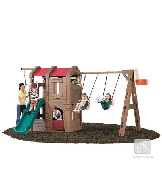 — удобная горка с боковыми поручнями;- качели оснащены удобными сиденьями из мягкого пластика; баскетбольный щит и веревочная лестница для спортивных игр;