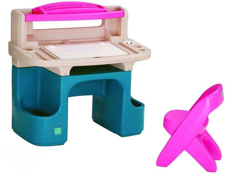 Откидная поверхность для рисования и письма легко очищается и открывается для доступа к вместительному нижнему отделению для хранения. Два глубоких встроенных боковых отделения предназначены для хранения книг, блокнотов и других предметов в пределах легкой досягаемости. Верхняя полка предназначена для хранения книг, цветных карандашей, маркеров и других письменных принадлежностей. Большая рабочая поверхность имеет встроенные углубленные отделения для красок, клея и других предметов. В комплект входит прочный стульчик с удобной спинкой