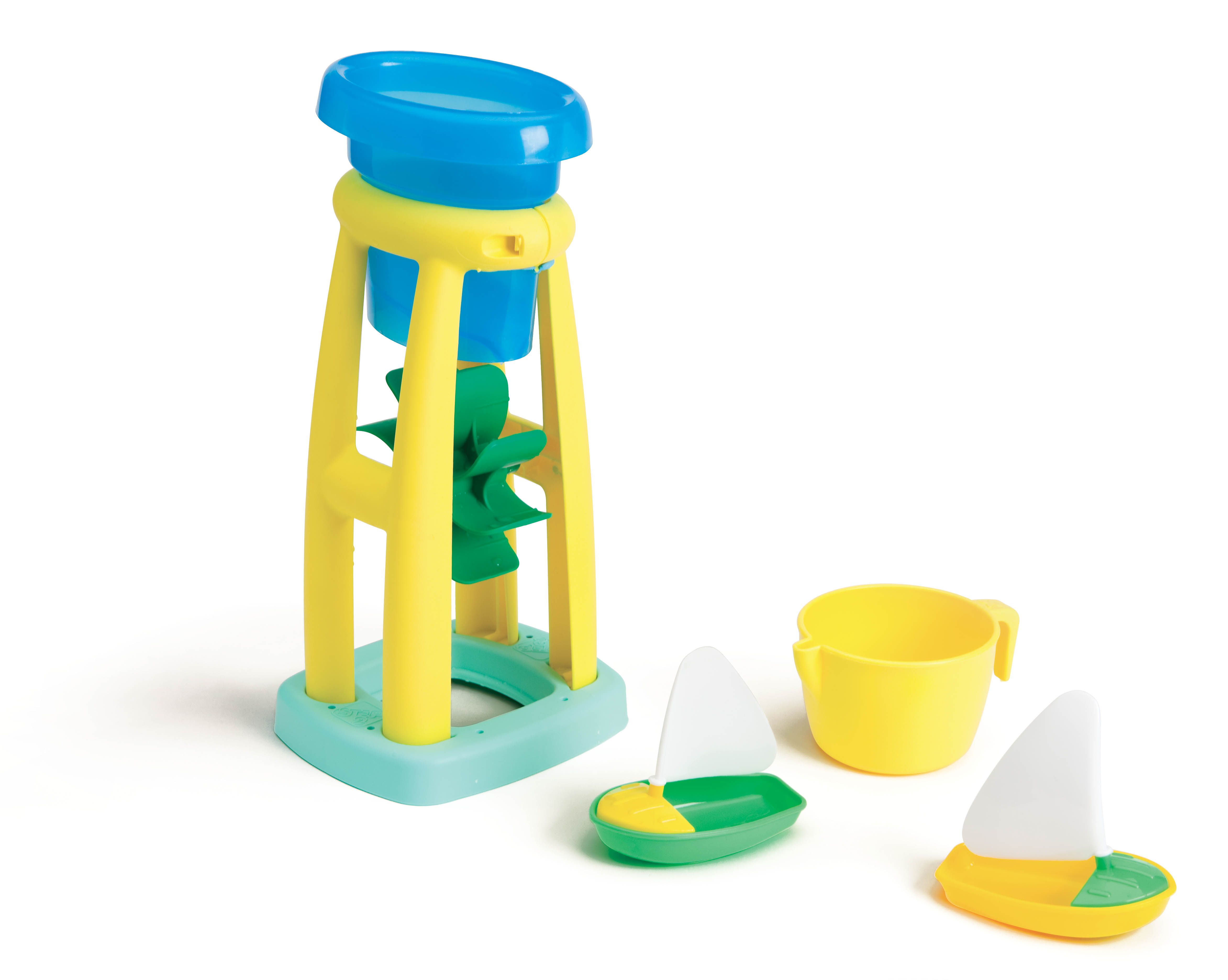 Подходит для улицы и помещения. Игровой столик с водяным колесом. Вода, льющаяся сквозь тоннель крутит колесо, которое распределяет воду в верхнюю и нижнюю гавань. Игровая зона поднята на уровень рук ребенка, что создает комфортные условия игры. Одновременно может комфортно играть 3 ребенка.