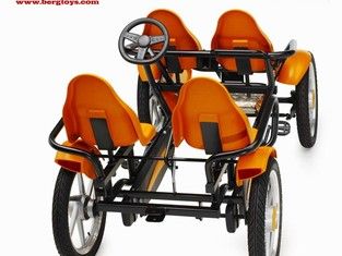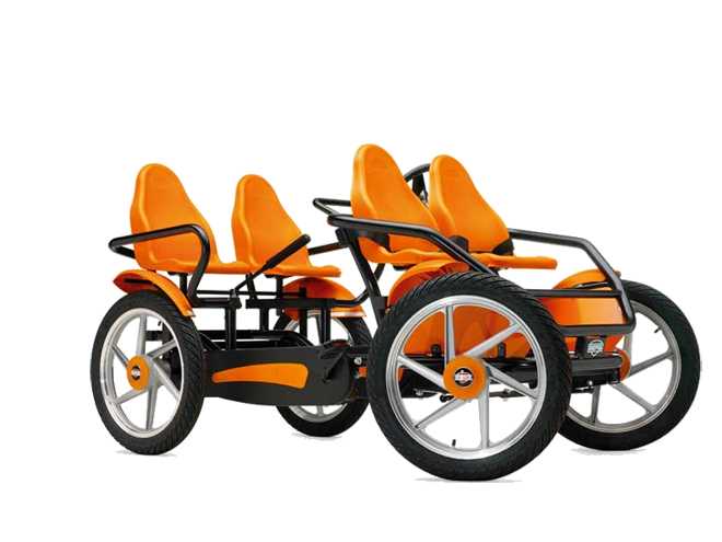 Прорыв в модельном ряде семейных веломобилей и веломобилей для коммерческого использования! Совершенно новая концепция включает такие особенности как: большие 17 дюймовые алюминиевые колёса; мощная лёгкая рама (вес пассажира может быть более 100 кг.); один ведущий руль, без переключателя передач; одновременно могут крутить педали 2 человека; передние кресла оборудованы удобными большими подлокотниками и ремнями безопасности. Никогда ещё семейные веломобили не были выполнены в таком продуманном дизайне! Привод F рассчитан на движение только вперед; Дополнительно есть возможность установить солнцезащитный навес.
