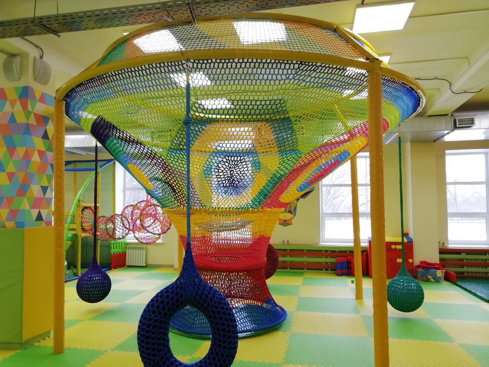 Вязаный лабиринт «Красочные сети «Дерево» превратит любое пространство в увлекательное и яркое приключение. По сетям можно карабкаться прыгать и бегать в любом направлении. Аттракцион «Красочные сети» вяжется вручную без узлов. Основной материал — это прочная высококачественная разноцветная нить толщиной 10 миллиметров. Аттракционы устанавливаются с помощью специальных креплений к стенам или колоннам, а также при помощи специального металлического каркаса, изготовленного с учетом особенностей помещения, в котором будет установлен аттракцион. Такое развлечение подарит детям огромное удовольствие и массу положительных впечатлений.